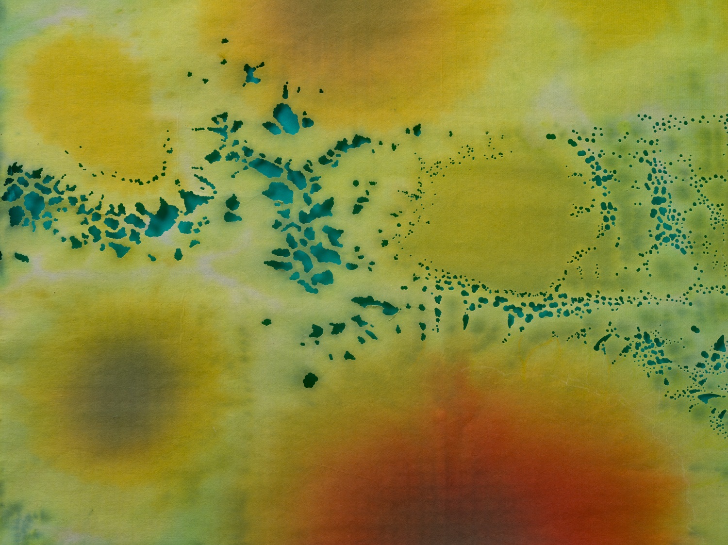Procion dyes, embroidery, collage, hand-cut perforations on Japanese paper