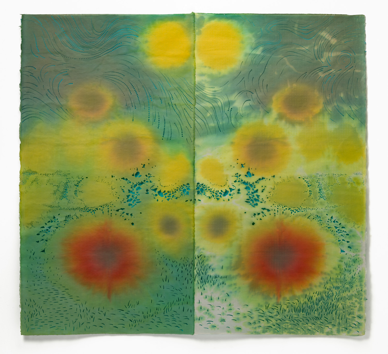 Procion dyes, embroidery, collage, hand-cut perforations on Japanese paper